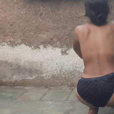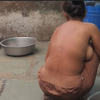 "In the country's bathroom of the village, the elder sister-in-law's stepsister is soaking her saree in water and bathi"