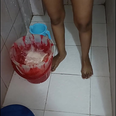 "Stepsister desi in beautiful red tights is bathing completely naked in the open bathroom in the stepsister red tights"